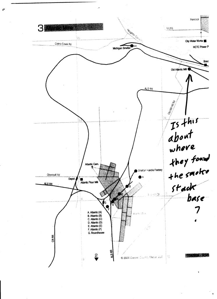 And the answer is, “Yes”. The hand-drawn arrow is pointing to exactly where we found this structure. Apparently the Old Atlantic Mill was the first attempt at building a smelter for the copper coming from the Atlantic Mine, and what we found was what was left of its chimney. The tunnel was leading from the actual furnace to the chimney base. I am told that this mill was not a success, and after a short period of operation it was replaced by the Michigan Smelter just down the road.