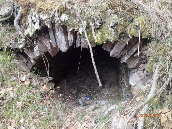 Inside, the tunnel is about 4-5 feet tall, and slopes generally upward into the hill. We didn’t go in, because it isn’t clear just how stable it is. The spot where a part of the roof has collapsed, and light is getting in, is somewhere around 40 feet down the tunnel.
