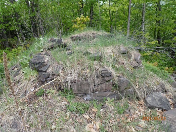 Whatever it was for, someone thought it was important enough to put a considerable amount of effort into constructing it. The flat stones look like they came from a shale bed at the bottom of the hill, so the stones had to be broken loose and hauled up about a 40 foot hill to get here. The surface structure looks vaguely like a chimney or a shaft furnace, but we didn’t see any obvious evidence that there was ever a fire in it.