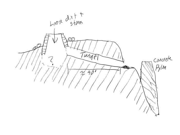 These aren’t the mystery. The mystery is this tunnel that was constructed into the hillside, right next to the concrete pylons. We have walked through here many times before and never noticed it, but it is possible that the entrance was covered over with soil and only recently eroded away enough to expose it.