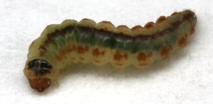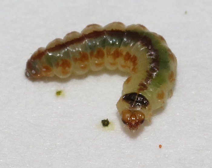 It was about the size of a grain of rice. What looks like a green stripe running down its back isn’t actually skin pigmentation, it is its digestive tract stuffed full of the green leafy matter that it has been eating.