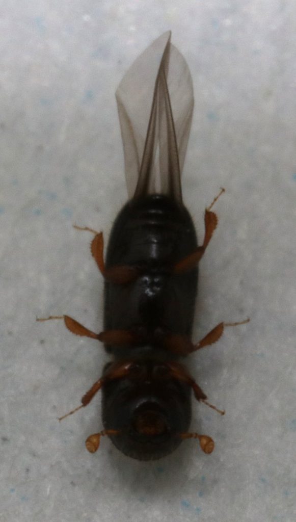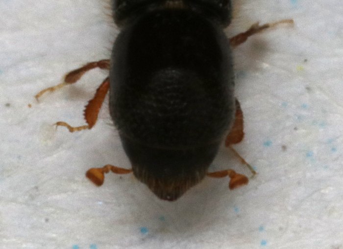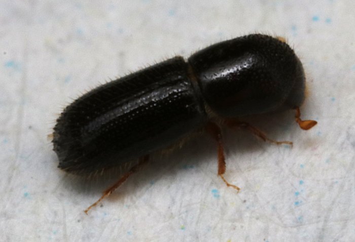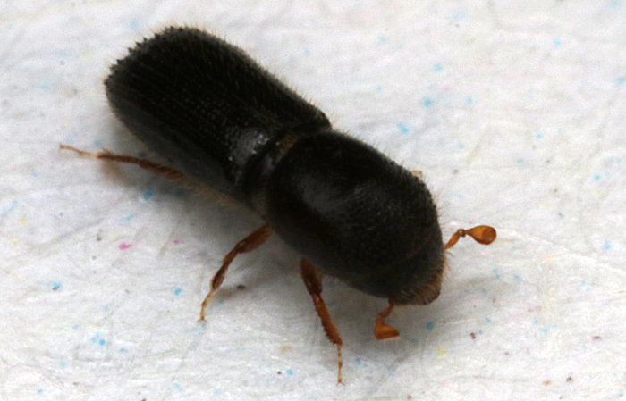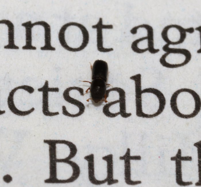 I thought this was one of the small beetles that are well-known for getting into houses, like drugstore beetles or cigarette beetles, but it turns out it doesn’t really look like either of those. What it does look like, is one of the bark-boring beetles in the genus Xyleborinus, of which there are several. All of which look a lot alike, and mainly differ in which kinds of trees they bore into.